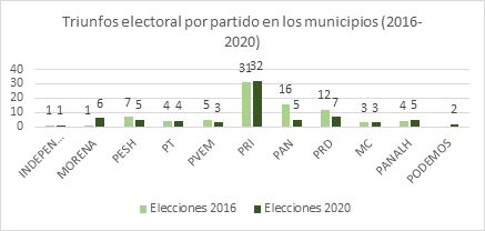 En 2020 el escenario electoral ha cambiado. Morena logró posicionarse como la tercera fuerza en el estado con el triunfo en 6 municipios. Además, al sumar sus alianzas con el Partido Encuentro Social Hidalgo (PESH), el Partido Verde Ecologista de México (PVEM), y el Partido del Trabajo (PT) lo colocan como segunda fuerza por su victoria en 5 espacios más, que da un total de 11 ayuntamientos. También, habría que sumar los triunfos de los partidos aliados a la 4T, que en total ganan en 12 municipios, es decir el bloque ganó 23 espacios que representa el 27% del total de municipios en el estado. Por cierto, Morena no logró mantener la victoria en aquel primer bastión de 2016 Chilcuautla, dónde le fue arrebatada la presidencia por el PRD.